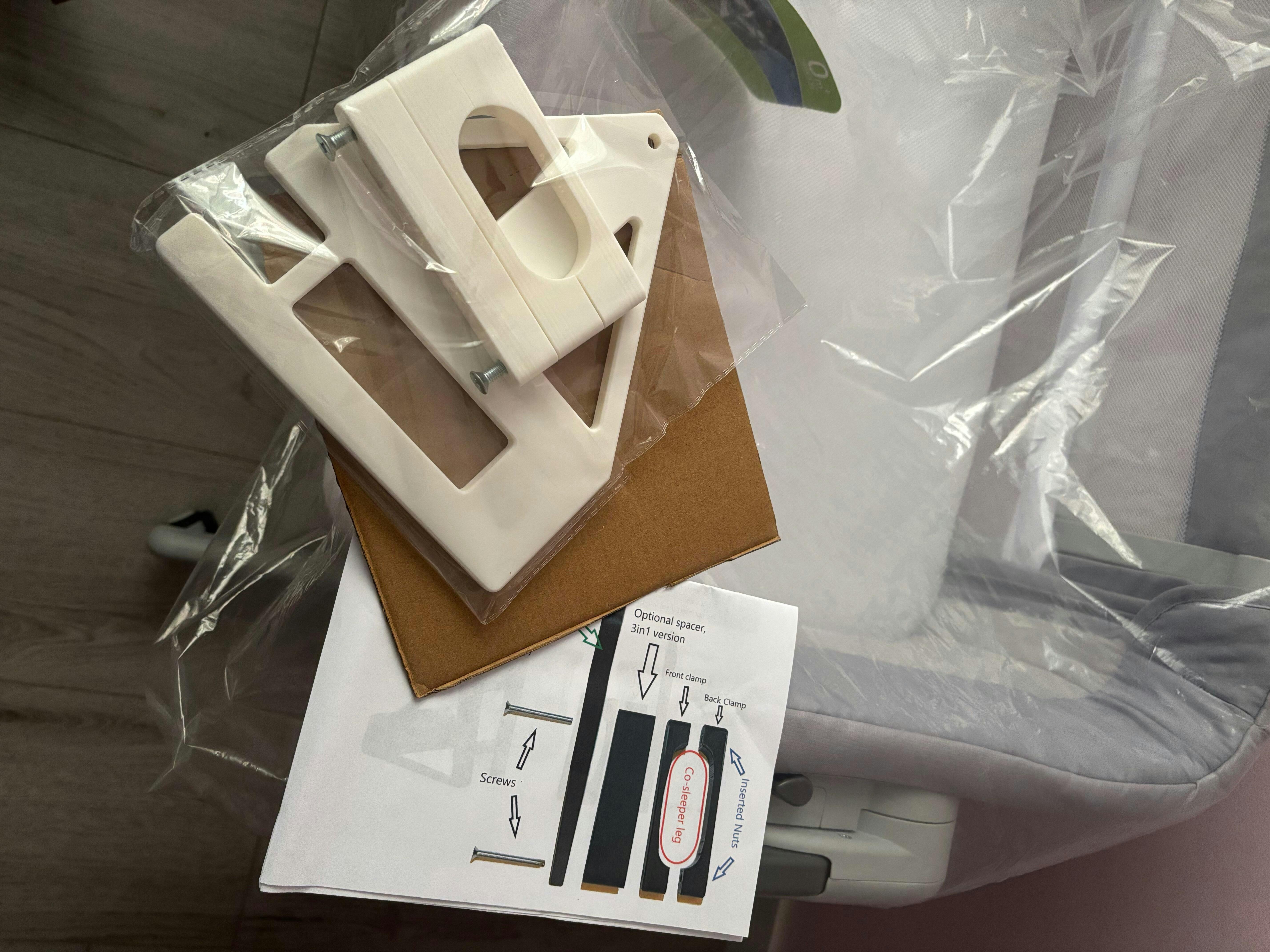 El soporte adaptador está impreso en 3D con plástico biodegradable y se fija con 2 tornillos alrededor del poste ajustable del colecho.